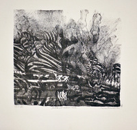 Stenlitografi i svart/vitt. Handtryck i avdragspress av Göran Wassberg och Manfred van de Loo. Upplaga: 75 st, H.C. 10 st. ”Litografiens figurer är målade med etsande gummi på den grovt kornerade stenen.” (Cecilia Frisendahl)