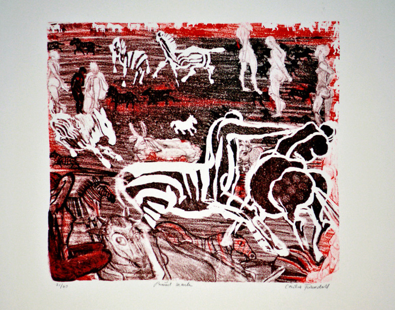 - En tonlitografi i vilken bilden målas upp med etsande gummi arabicum och valsas upp med pennfärg på hård vals, i omgångar som skapar många valörer. Tryckt i snällpressen Johanna, Veddesta.